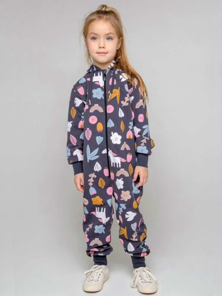 Набивной комбинезон для девочки из петельчатого футера, произведенного из натурального хлопка.
