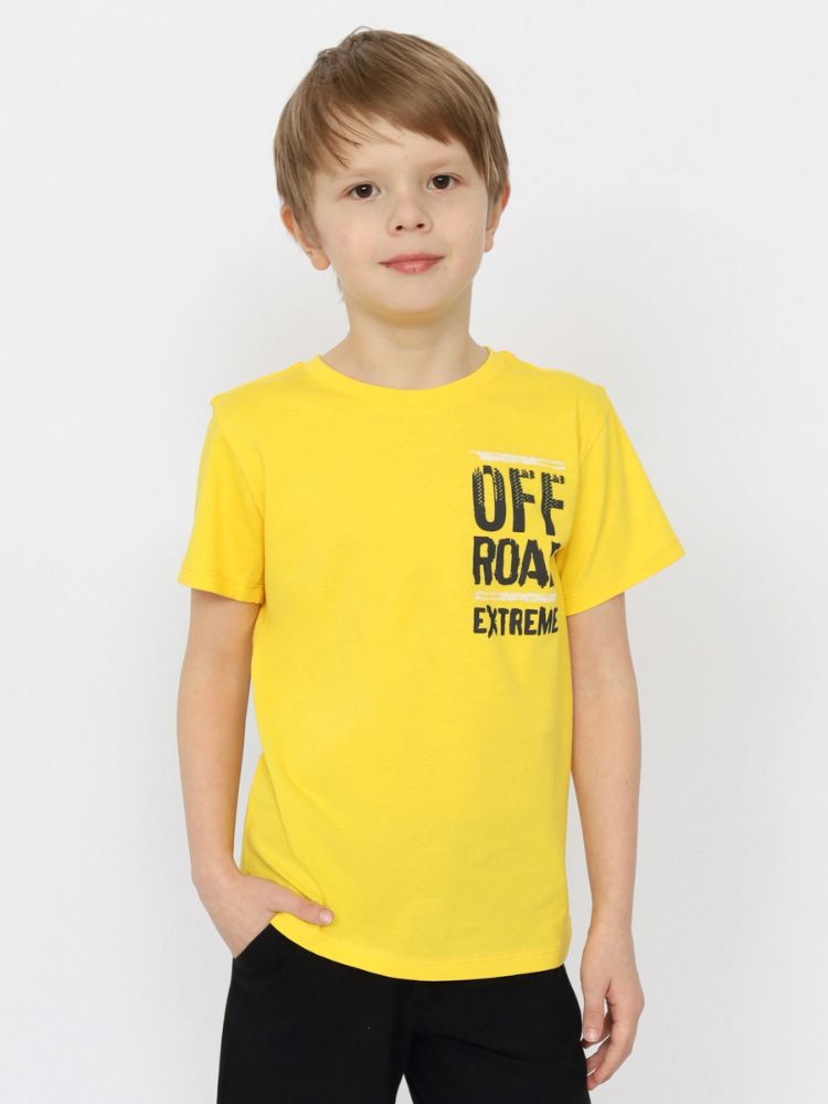 Футболка для мальчика с коротким рукавом из полотна с набивкой. Горловина обработана притачной бейкой из рибаны с лайкрой. Перед декорирован принтом.