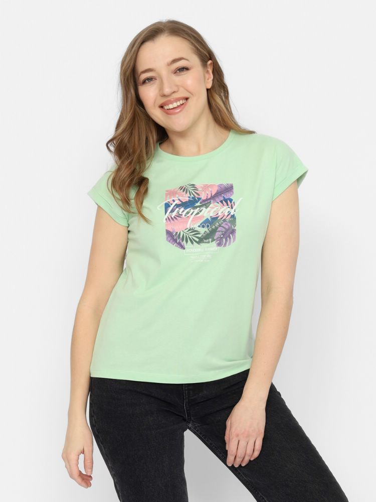 Футболка с короткими цельнокроенными рукавами с отворотами. Низ удлинённой спинки оформлен дугообразно. Горловина круглая, обработана притачной бейкой из рибаны с эластаном. Перед футболки декорирован принтом.