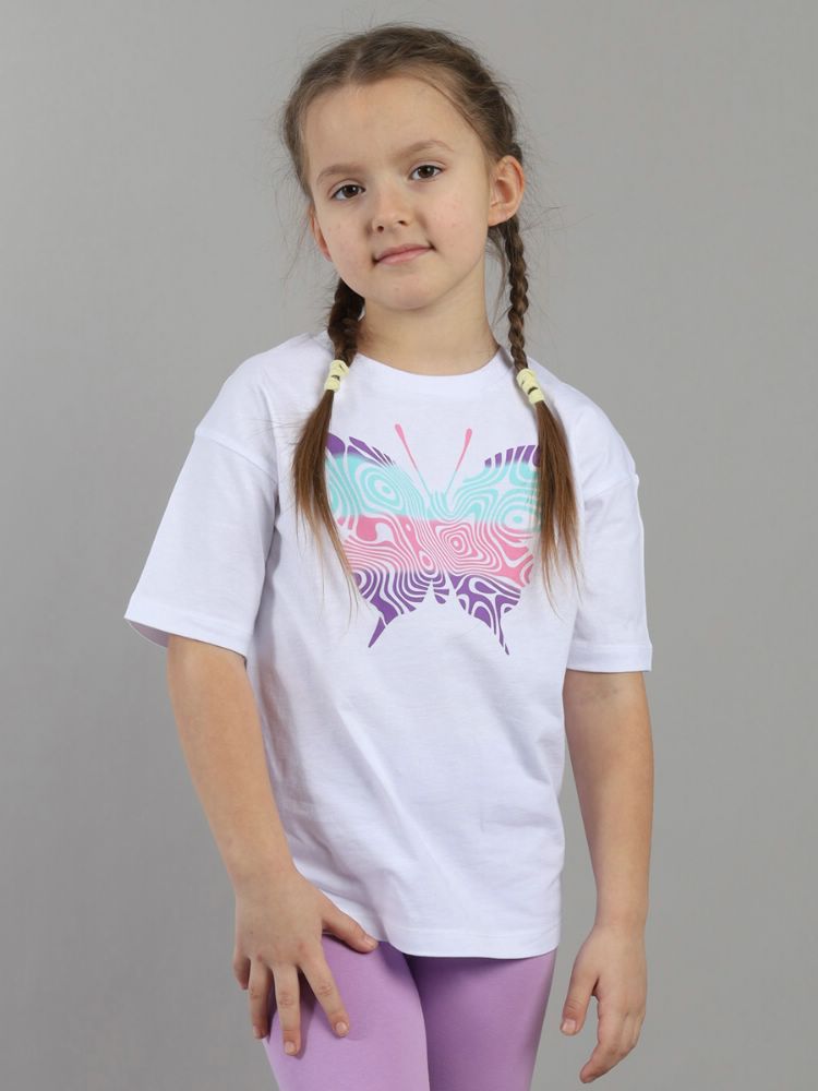 Футболка для девочки свободного силуэта из мягкого трикотажа. Горловина круглая, оформлена кашкорсе. На полочке выполнена шелкография - девочка с бантиком.