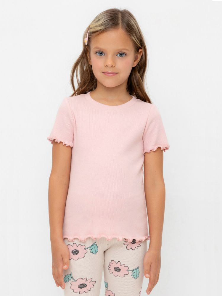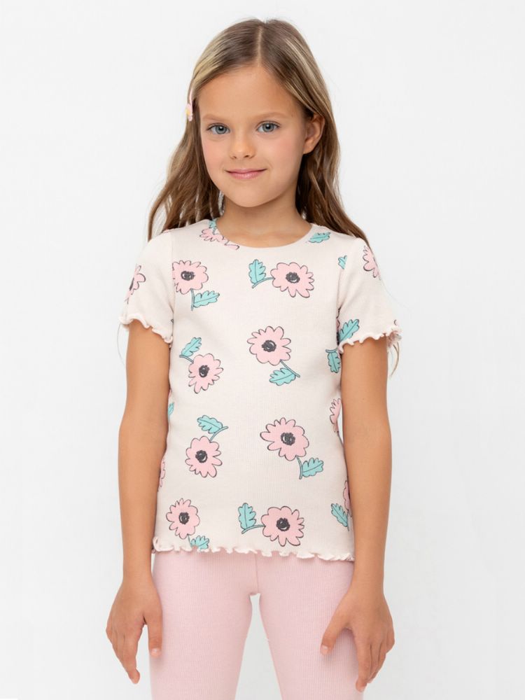 Футболка для девочки из мягкого трикотажа в рубчик c милой набивкой в виде ромашек. Горловина круглая, оформлена кашкорсе. Низ рукавов и низ изделия оформлен декоративным ролевым швом. На полочке расположен декоративный элемент с сердечком.